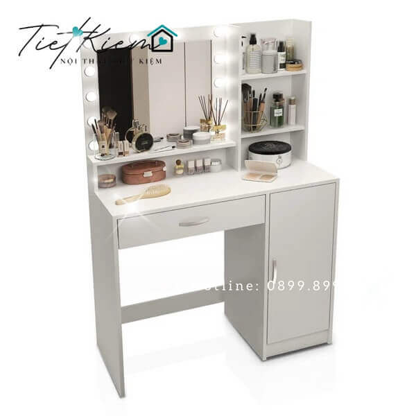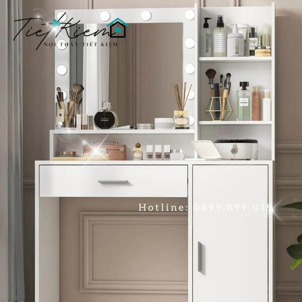 - Bàn trang điểm đa năng có gương đèn LED: Kết hợp nhiều ngăn kéo lưu trữ tiện lợi.