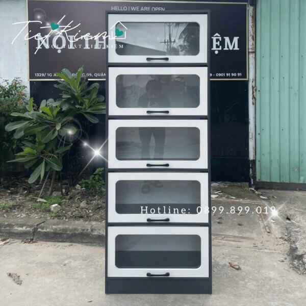 - Tầng dưới cùng: tận dụng để thùng rác nhỏ, chai nước hoặc xoong nồi lớn