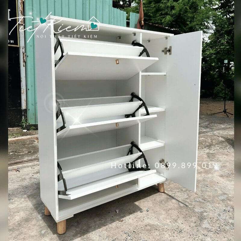 - Tủ giày thông minh đẹp thiết kế 3 cánh lật ngang 60cm: Ngang 60cm x Cao (1m1 – 1m2) x Sâu (25cm – 30cm)