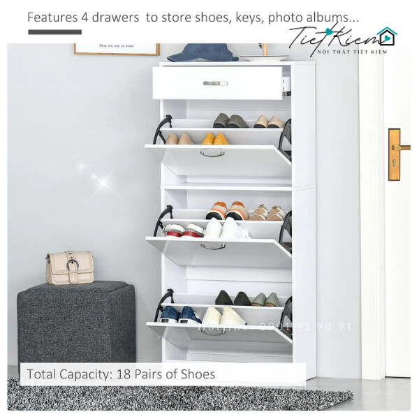 - Tiết Kiệm Không Gian: Thiết kế giúp bạn tận dụng tối đa diện tích phòng khách, tạo ra nhiều không gian lưu trữ cho giày dép và phụ kiện một cách gọn gàng và ngăn nắp.