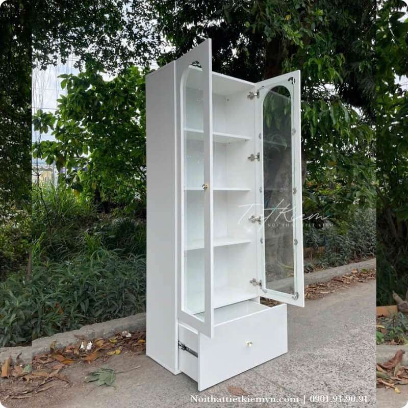 Nếu bạn sở hữu nhiều túi xách, giày, nước hoa hay đồng hồ, chiếc tủ này sẽ giúp bạn giữ đồ luôn sạch sẽ, không bị bụi bẩn hay ẩm mốc. Đèn LED tích hợp giúp từng món phụ kiện trở nên lung linh như được trưng bày tại showroom cao cấp.